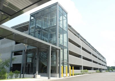 The structure is a free-standing total precast garage that includes a horizontally ribbed form liner finish and a dark charcoal color on the exterior. The structure has a punch-through stair at one end with a feature stair with elevator tower at the opposite end. Tree columns on the feature stair support the roof and stair risers. All these elements are dark charcoal in color to match the exterior of the garage.