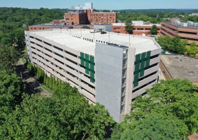 Overlook Medical Center in Summit, New Jersey, sits high on a steep slope above the community. Due to its hillside location, land for additional development is limited. When the hospital needed to solve a patient parking crunch and provide easier access to parking close to patient services, a creative approach to a new employee parking structure on the perimeter of the campus was an appealing solution.